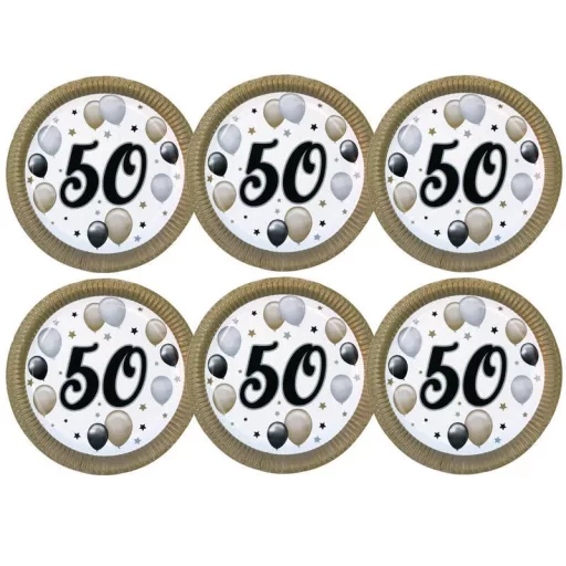 Nagyszerű és elegáns léggömb mintás 50-es számos szülinapi party tányér. Mérete: 23 cm. Anyaga: papír. 6 db tányér/csomag.