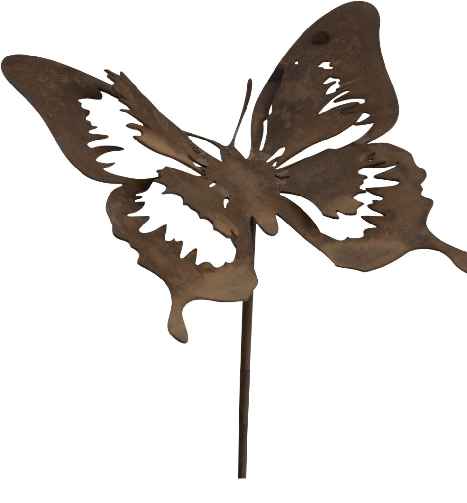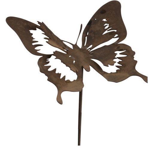 Stilizált pillangóformájú kerti dekor, melyet 40 cm-es beszúró szárral láttak el. A 12×12 cm-es, könnyed, áttört fémlemez rozsdás felületet kapott – elegáns, mégis játékos eleme a kertnek.
