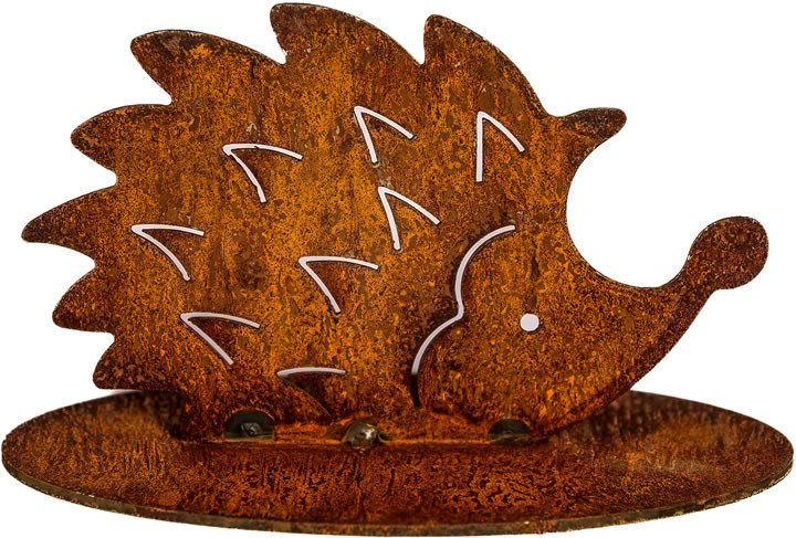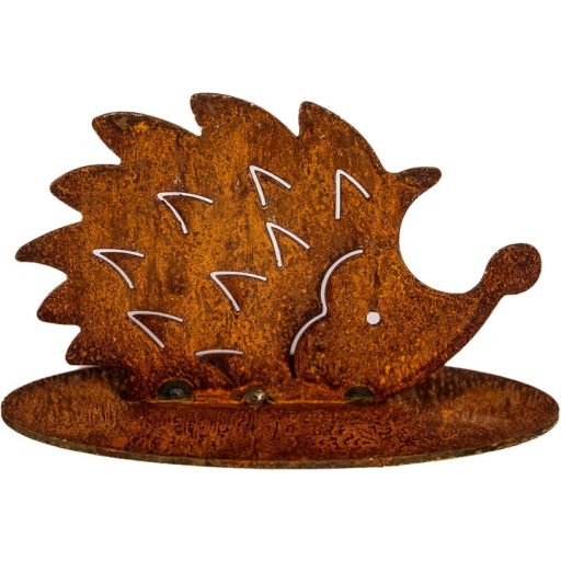 Kedves süni figura fémlemezből, vízszintes talapzatra helyezhető kivitelben. Mérete 13×8 cm, rozsdás hatású felületkezeléssel. Stabil, mozgatható dekoráció kültérre vagy fedett helyre.