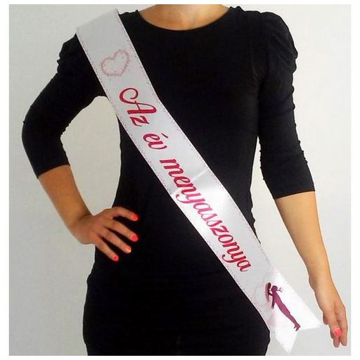A menyasszony elengedhetetlen kelléke. Mérete: 180 cm x 9,5 cm. Anyaga: szatén. A csomagban öntapadó tépőzárkorong található, mely segítségével saját méretedre állíthatod a vállszalagot.