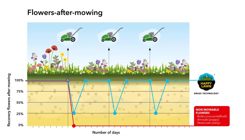 A Happy Lawn® technológiának köszönhetően Ön kedvező hatást gyakorolhat közvetlen környezetére. Egy olyan megoldás, amely ötvözi magában az ellenálló pázsitot, valamint a nyírható virágokat. Ezek olyan virágok, amelyeket újra és újra le lehet nyírni a fűvel együtt, azonban minden nyírás után megújulva visszanőnek, ezáltal az Ön pázsitja könnyen kezelhetővé, dússá és színessé válik.