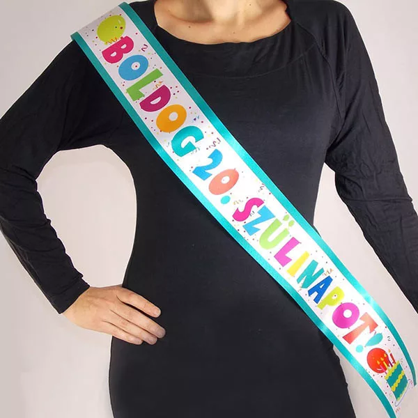 A 20. életévet betöltő szülinapos remek és kötelező kiegészítője. Mondd el mindenkinek, hogy ma lettél 20 éves. Kezdd el az ünneplést már a szülinapod kezdetével, és viseld büszkén ezt a színes, vidám mintás, Boldog 20. Szülinapot! - feliratú vállszalagot.. Mérete: 180 cm x 9,5 cm. Anyaga: Szatén. A csomagban található öntapadó tépőzárkorong található, mely segítségével saját méretedre állíthatod a vállszalagot.
