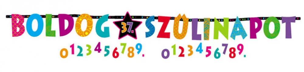 Színes, vidám színű, Boldog Szülinapot feliratot megformáló számozható betűfüzér. A csomagban 20 darab szám található, minden szám kétféle színben. A kívánt számok ragasztópöttyök segítségével rögzíthetőek, melyek a csomagban megtalálhatóak. Mérete: a füzér teljes hossza: 240 cm, szélessége: 19,5 cm. Anyaga: papír.