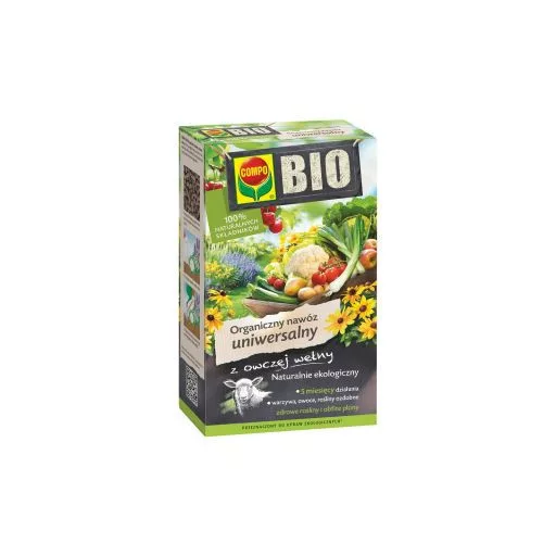 A neves Compo® márka által gyártott BIO Univerzális műtrágyát úgy fejlesztették ki, hogy minden növény táplálkozási igényét kielégítse: dísznövényfajok, zöldségek, apró gyümölcsök és gyümölcsfák. Granulált formában kapható, amely egyszerű alkalmazást tesz lehetővé. A magas gyapjútartalomnak köszönhetően huzamosabb ideig használható. A rost, a bemutatott termék fő összetevője, nagy mennyiségű nitrogént, káliumot és foszfort tartalmaz. Megkapta a BIO tanúsítványt, mivel csak természetes összetevőkből áll. Bio kultúrákban biztonságosan alkalmazható.