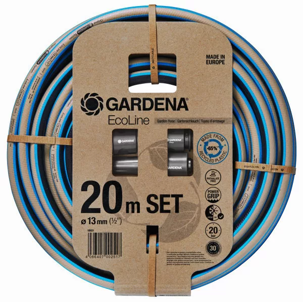Csomagolási forma: 100%-ban újrahasznosított és újrahasznosítható kartonból készült terméktasak. Műanyag elemek: Legalább 65% újrahasznosított műanyagból készült. Ebből újrahasznosított háztartási műanyaghulladék: > 45% Ebből újrahasznosított ipari műanyaghulladék: > 15% Alkalmazás: Vízszállításra Fagy elleni védelem Átmérő: 13 mm (1/2") Hossz: 20 m Szakítószilárdság: 20 bar Alapanyag: TPE és magas minőségű szövetháló Jellemzők: Nem tartalmaz ftalátokat és káros anyagokat <0,1%). UV-álló. Tulajdonságok: POWER GRIP – speciális bordázat a tökéletes csatlakozásért és a GARDENA rendszerelemekkel való optimális illeszkedésért.