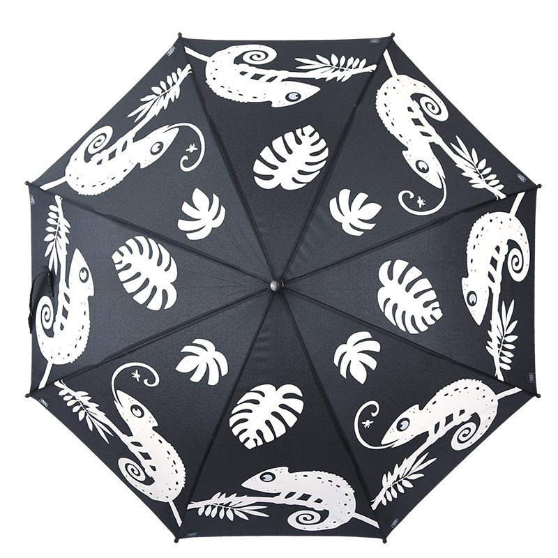 Különleges esernyő kaméleonos díszítéssel. Egyediségét színváltós tulajdonsága adja, mivel napos időben a minta fehéren marad, míg eső közben használatkor színesre vált. Ajánljuk azoknak, akik egy igazán különleges darabra vágynak. Kisebb méretéből adódóan a gyerekeknek is könnyen használható lesz.
