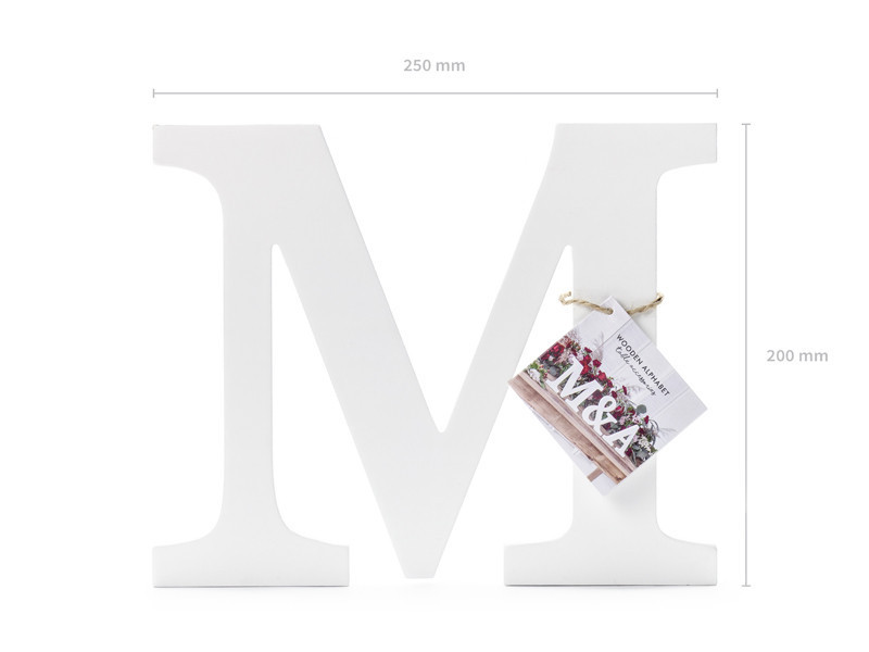 Az M betű fehér fából készült, szélessége kb. 25 cm, magassága kb. 20 cm