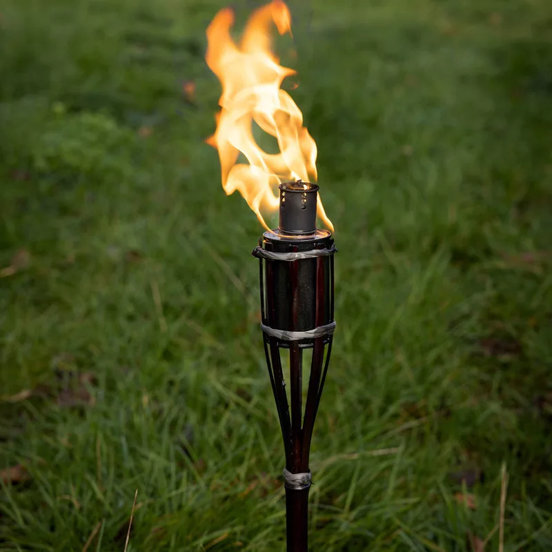 Fekete bambusz fáklya. A bambuszból készült fáklya meghitt hangulatot teremt, bármely kert tökéletes dísze, de látványos dekorációként szolgál a teraszon is. A fáklya könnyedén leszúrható a földbe. Kétirányú nyithatóságának köszönhetően egyszerűen feltölthető. A fáklyával megvilágított kert, medence, de akár a kerti vacsora asztal is különleges légkört teremt. Szúnyogok ellen is használható nyári estéken, hiszen a fáklya tartályába szúnyogriasztós olaj is tölthető.