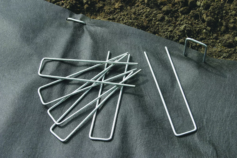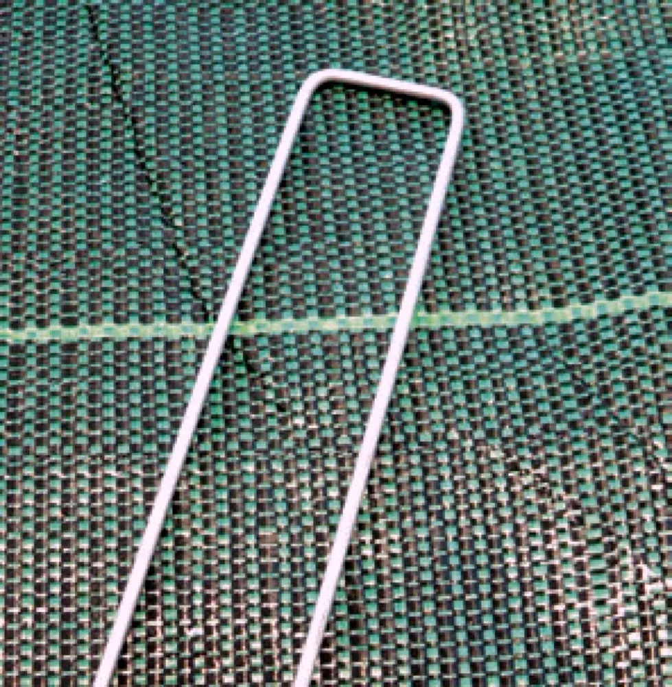 Fém leszúró tüske. Takarófóliák és talajtakaró fóliák illetve vakondhálók földhöz való rögzítéséhez. Anyaga: fém, "U" alakú, méret: 17 x 3,5 cm, 10 db van egy csomagban.