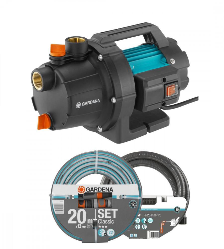 A GARDENA Kerti szivattyúkészlet mindent tartalmaz, amire az elektromos szivattyú gyors csatlakoztatásához és beindításához szükséges. A készlet tartalma: egy Classic Kerti szivattyú 3000/4, egy 3,5 méter hosszú GARDENA szívótömlő 20 méteres GARDENA kerti tömlő locsolófej és csatlakozóelemek A kompakt és tartós GARDENA Kerti szivattyú 3000/4 modellt a kertben előforduló különféle szivattyúzási feladatokra terveztünk. Meg tudod öntözni a növényeket, emelni a víznyomást és átszivattyúzni a talajvizet, a csapvizet, az esővizet, sőt akár a klórozott vizet az úszómedencéből. A Kerti szivattyú 3000/4 segíti, könnyebbé és hatékonyabbá teszi a kertészkedést. Nem okoz gondot, ha a kútból, tározóból vagy esővízgyűjtő hordóból kell az esőztetőhöz vagy a locsolófejhez eljuttatni a vizet. Ez a könnyű, tartós és kompakt elektromos szivattyú egyszerűen használható, nagy szívóerőt biztosít nagyon magas nyomás mellett. Feltöltése és leeresztése egyszerű az extra töltőnyílásnak és a leeresztő csavarnak köszönhetően. Ez a tulajdonság lehetővé teszi a víz leeresztését, így a szivattyú védve van az esetleges fagykár ellen télen. A szivattyú hordozása sem jelent problémát az ergonomikus kialakítású fogantyúval és a kis súlyú kivitellel. Sőt, a talajra helyezve a szivattyú megbízhatóan üzemel. A beépített főkapcsoló teszi lehetővé a kényelmes használatot. A tartós rézcsavar-betétek tökéletesen használhatók a fix felszereléshez, míg a G1” dupla adapterek egyszerű csatlakoztatást tesznek lehetővé az összes GARDENA kiegészítővel, például a szívó- és kerti tömlőkkel. A kerti szivattyút használat közben a hővédő kapcsoló védi, amely leállítja a túlhevült motort. A GARDENA szivattyúk nem alkalmasak sós víz, agresszív vagy könnyen éghető anyagok és élelmiszer szivattyúzására. A Kerti szivattyú 3000/4 kiváló belépő szintű termék, ha könnyebbé szeretnéd tenni a kerti munkákat és szívesen használnál egy több funkciós szivattyút a kertedben. A GARDENA megbízható piacvezető 40 évnyi tapasztalattal a szivattyútervezés és -gyártás területén. Ez a szivattyú megéri az árát, ha alkalmi használatra keresel gépet. Teljesítmény 600 W Max. szállított vízmennyiség 3000 l/h Max nyomás 3.5 bar Max. önfelszívás 7 m Max. szállítási magasság head 35 m Kábel hossza 1.5 m Tápkábel típusa H07 RNF Elektromos védelmi osztály IP X4 A sokoldalú Univerzális kerti szivattyú öntözéshez, nyomásnöveléshez és egyéb szivattyúzási és vízátvezetési feladatokhoz. Használható csapvízzel, talajvízzel, esővízzel és klórozott uszodai vízzel egyaránt. Egyszerű használat Gyorsan és egyszerűen csatlakoztatható, könnyen feltölthető vagy leereszthető. A GARDENA Kerti szivattyú 3000/4 ideális modell. Magas víznyomás A szivattyú magas, akár 3,5 bar üzemi nyomáson működik, amely elegendő hosszabb tömlőkhöz vagy esőztetőkhöz, pl. a GARDENA AquaZoomhoz. Ne hagyd abba a kertészkedést Ergonomikus és könnyű markolatával egyszerűen szállítható, tartós anyagokból készült. Működése gyors a kapcsolónak és a töltő csonkoknak köszönhetően. A szivattyú igazán kényelmesen szállítható a kívánt helyre. Kényelmes feltöltés és leürítés Fröcskölésmentesen és egyszerűen, tölcsér nélkül feltölthető az extra töltőnyílásnak köszönhetően. A leeresztő csavarral a maradék víz is leüríthető, ami megvédi a szivattyút az esetleges fagy okozta károktól. Rézmenetek A tartós rézbetétek tökéletesek a fix felszereléshez. A két G1 dupla csatlakozóelemet tartalmazza a csomag, és lehetővé teszik a GARDENA tartozékok, például a tömlők vagy szűrők egyszerű csatlakoztatását. Hővédőkapcsoló A hővédőkapcsoló megakadályozza a motor túlhevülését.