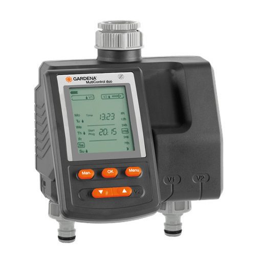 A GARDENA MultiControl duo öntözőkomputerrel két különböző kertterületet öntözhet. Például a gyepet a ház mögött és a virágágyást az előkertben. Mindkét kimenet külön programozható. Ami azt jelenti, hogy: külön-külön beállíthatja az öntözés kezdetét, időtartamát és gyakoriságát. Kimenetenként napi 3 öntözés lehetséges és az öntözés időtartama akár 3 óra 59 perc is lehet. A könnyed programozhatóság érdekében a kezelőfelület levehető. A funkciók gombnyomással kiválaszthatóak. Az egyedi működésnek és a kijelzőn lépésenként beállítható öntözési adatoknak köszönhetően a beállítás nagyon egyszerű. A nagy kijelzőn minden adat jól látható. A víztakarékos öntözéshez eső és talajnedvesség érzékelő szenzorral is csatlakoztatható. Ez az intelligens funkció megszakítja avgy megakadályozza az öntözést ha esik az eső vagy elég nedves a talaj. Mindkét kimenethez csatlakoztatható. Éjszakai programnál az öntözés automatikusan elindul, ha a csatlakoztatott talajnedvesség érzékelő szárazat jelez. Az öntözőkomputer 26,5 mm-es (G3/4) és 33,3 mm-es (G1) menetű vízcsapra csatlakoztatható, üzemi nyomás: 0,5 - 12 bar. 1 db 9 V-os alkáli elemmel az üzemidő kb. 1 év. Az elem töltöttségi kijelző jelzi, hogy mikor szükséges az elemet cserélni. Az elemet a csomagolás nem tartalmazza.
