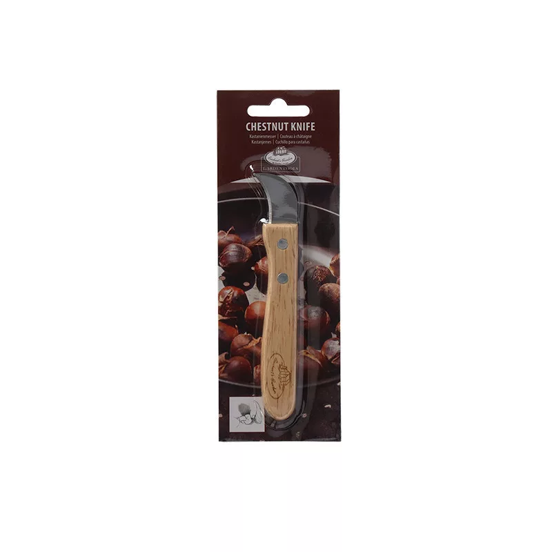 Ezt a rozsdamentes acélból és fából készült kést kifejezetten arra tervezték, hogy a gesztenyét sütés előtt könnyen felszeletelje és meghámozza. Ideális választás az FF156 kerti gesztenyesütő serpenyővel kombinálva.