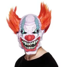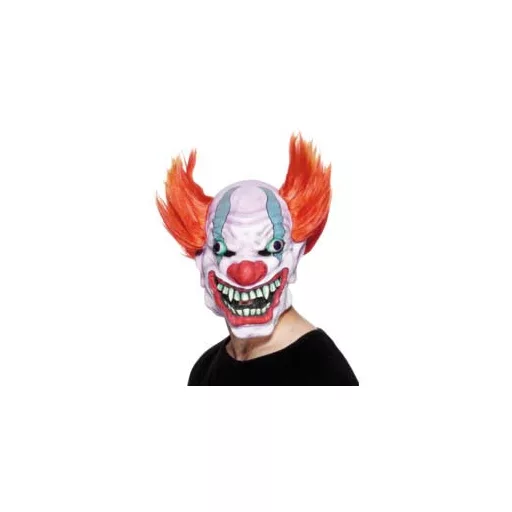 Ijesztő, gonosz bohóc arc a tökéletes borzongató hatás eléréséhez.Lilás fehér gumi álarc, ijesztő vigyorral, narancssárga hajjal. A maszk az egész fejet befedi.Mérete: felnőtt. Egy méretben.