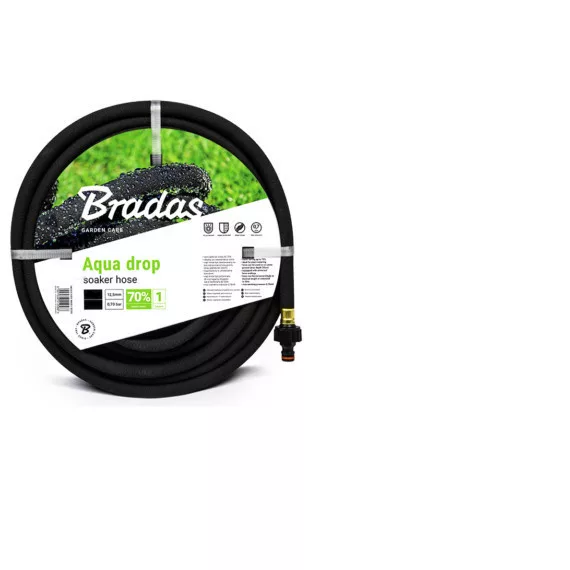 WAD1 / 2015 Öntözőtömlő AQUA-DROP 1/2 "- 100m áztatótömlő AQUA-DROP - tömlő - rugalmas és tartós, 100% -ban újrahasznosított, kiváló minőségű gumiból készül, amely lehetővé teszi a víz teljes hosszában való átjárhatóságát. Akár 70% -os víztakarékosságot biztosít. A beépített standard gyorscsatlakozó adapterek gyors és egyszerű csatlakoztatást tesznek lehetővé a kerti tömlővel. Kéreggel borítható, vagy legfeljebb 20 cm mélyen a föld alá temethető. Ideális a növények pontos és hatékony öntözéséhez. A tömlőt a kívánt hosszúságnak megfelelően lehet vágni. Vízhatékonyság 1m-enként: 0,76l - 1,26l / perc 0,7BAR nyomáson. A készlet tömítéssel rendelkezik, amely csökkenti a nyomást. Figyelem: - ivó vízhez ne használja - öntözéshez ne használjon forró vizet EAN: 5907544412571