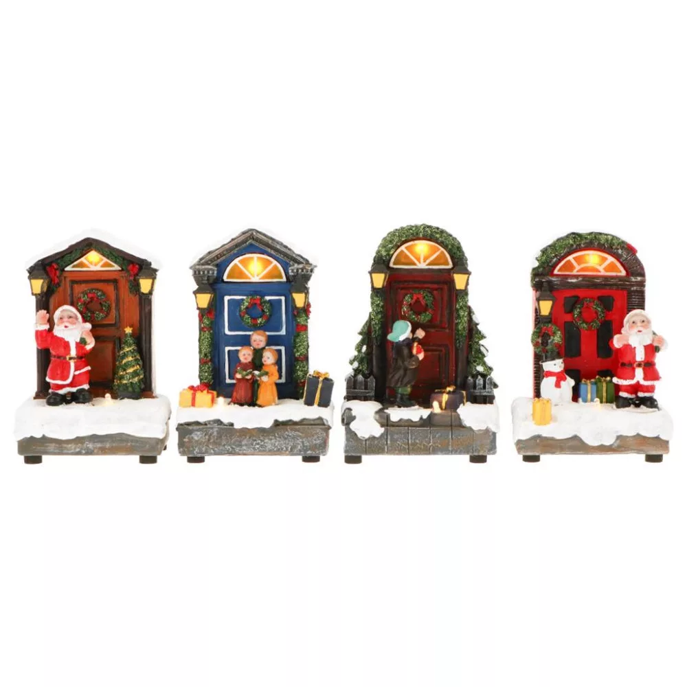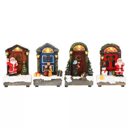 A 13 cm magas kékkarácsonyi ajtó különleges színvilágával és apró részleteivel hívja fel magáraa figyelmet. A hóval fedett keret, a mikulásos dísz és az apró feliratokautentikus hangulatot adnak a dekorációhoz. Használható önálló díszként, detöbb színű változattal (bordó, barna) együtt karácsonyi falut is építhetünkbelőlük.