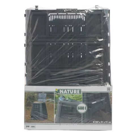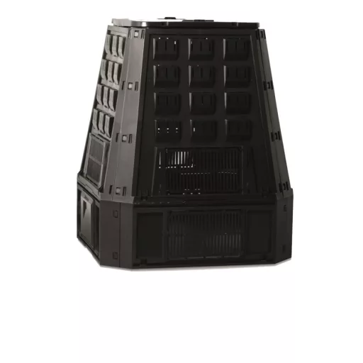 Komposztáló, műanyag - 107x91x91cm 600 liter. Komposztláda fekete színű, ellenálló polipropilénből. A kapcsolódó zsanérszerkezettel egyszerűen és gyorsan összeilleszthető. A modelltől függően ezek a ládák 300–1200 l-es kapacitással rendelkeznek. Egyszerűen tárolhatók mivel teljesen összecsukhatók. Két nyílásuk van: egy zsanérozott fedél a hulladék behelyezéséhez és egy elülső ajtó a komposzt átforgatásához vagy eltávolításához. A gyártási folyamatban Thermolen hőszigetelő anyag kerül az oldalsó falra, ami kedvez a hőmérséklet-növekedésnek és a hőmérséklet fenntartásának a hulladék gyorsabb lebomlása érdekében. Mérete: M 107 x 91 x 91 cm - 600 liter