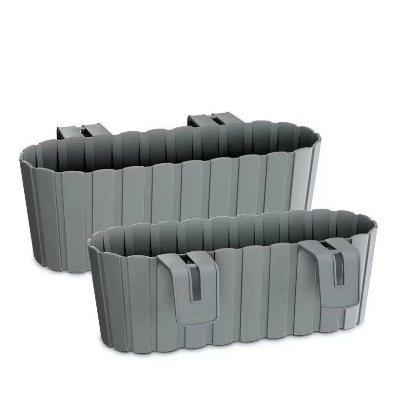 Bordázott mintájú, enyhén ovális formájú korlátláda, melybe kedvenc balkonvirágait ültetheti. A két akasztó közötti távolság 12 cm. Mérete:(Hosszúság x Szélesség x Magasság) 21,2 x 38,3 x 13 cm