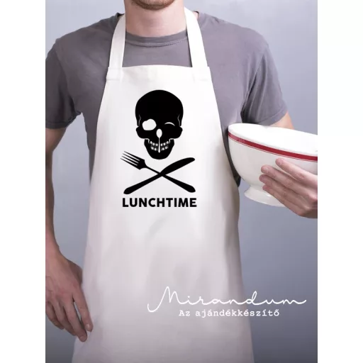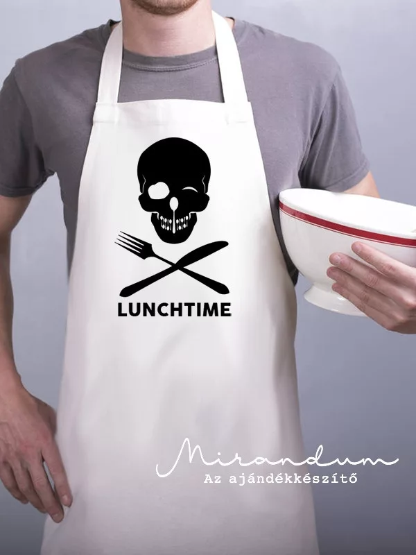 A „Lunchtime” kötény azoknak szól, akik nemfélnek kicsit merészebben megjelenni a konyhában. Fehér anyagon feketekoponya-grafika díszeleg, ami egyszerre humoros és vagány. Vastag, strapabírópamut-keverékből készült, jól bírja a mindennapos használatot. Könnyentisztítható, mosógépben mosható. Ajándéknak is kiváló, főleg azoknak, akikszeretik a szokatlan stílust. A kötény állítható, így minden testalkatrapasszol.