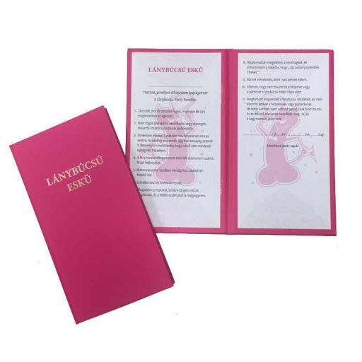 A lánybúcsú olyan parti, amely minden menyasszony életében egy eszméletlen buli estét jelent. Legyen szó akár egy szolidabb, vagy egy vad lánybúcsú buliról, egy biztos, ami a lánybúcsú keretein belül történik, az csak a lánybúcsú partin résztvevők között is marad. A Lánybúcsú Eskü tétel elmondásával, a menyasszony ünnepélyes esküt tesz, és tagjává válik a Lánybúcsú Parti Rendnek. Ez a Lánybúcsú Eskü Könyv 11 pontban tartalmazza a Lánybúcsú Parti Rendjének alapvető és követendő szabályait. A Lánybúcsú Eskü Könyv felolvasása, elfogadása és aláírása után elkezdődhet a lánybúcsú parti. A Rendhez való tartozás mellett ez a Lánybúcsú Eskü Könyv egy felejthetetlen lánybúcsú parti örök emléktárgya is lesz. Anyaga: karton. Mérete: 18,5 cm.