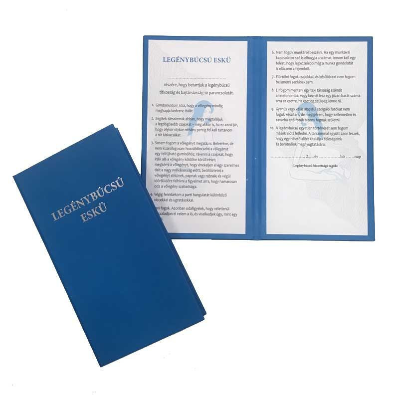 A legénybúcsú olyan parti, amely minden vőlegény életében egy eszméletlen buli estét jelent. Legyen szó akár egy szolidabb, vagy egy vad legénybúcsú buliról, egy biztos, ami a legénybúcsú keretein belül történik, az a legénybúcsú partin lévő résztvevők között is kell, hogy maradjon. A legénybúcsú Eskü tétel elmondásával, a vőlegény ünnepélyes esküt tesz, és tagjává válik a Legénybúcsú Parti Rendnek. Ez a Legénybúcsú Eskü Könyv 10 pontban tartalmazza a Legénybúcsú Parti Rendjének alapvető és követendő szabályait. A Legénybúcsú Eskü Könyv felolvasása, elfogadása és aláírása után elkezdődhet a legénybúcsú parti. A Rendhez való tartozás mellett ez a Legénybúcsú Eskü Könyv egy felejthetetlen legénybúcsú parti örök emléktárgya is lesz. Anyaga: karton. Mérete: 18,5 cm.