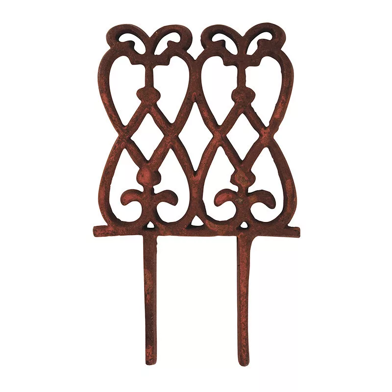Öntöttvas ágyásszegély klasszikus mintával, amely kerti kerítésként is használható és ágyások szétválasztására is alkalmas. Masszív anyaga miatt a fa,- és egyéb ágyásszegélyekkel szemben sokkal időtállóbb. Látványos, könnyen leszúrható és egyszerűen áthelyezhető kerti dekoráció. Rusztikus hangulatot csempészhetünk vele otthonunkba. Öntöttvas jellegéből adódóan külső elhelyezés esetén, a korrózió megjelenésével egy patinásabb, rusztikusabb termék válik belőle.