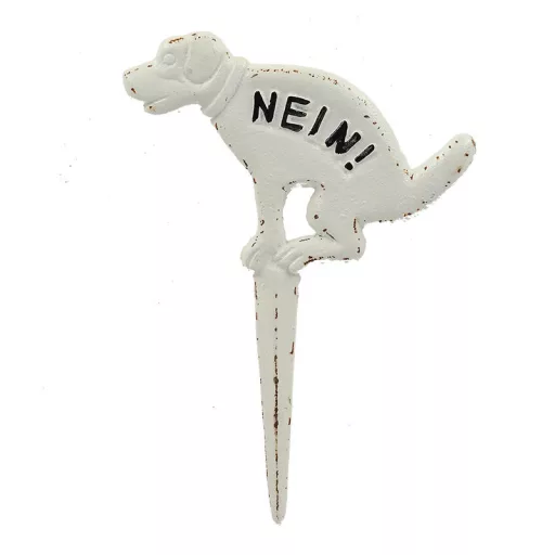 Öntöttvasból készült, kutya formájú , leszúrható tiltó tábla kutyát sétáltatóknak, "Nein" felirattal. Fehér színben kapható. Anyagösszetételének köszönhetően ellenáll az időjárás viszontagságainak. Öntöttvas jellegéből adódóan, kinti használat esetén a korrózió megjelenésével egy patinásabb, rusztikusabb termék válik belőle.