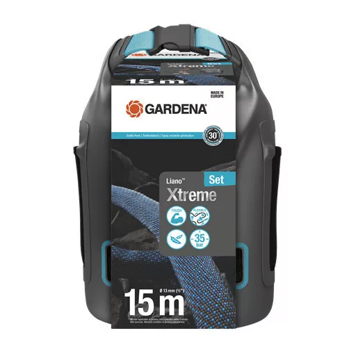 Használd a GARDENA Liano™ Xtreme 15 m-es textiltömlő készletét tárolótáskával a hosszú, nehéz kertöntözéshez. A 15 m hosszú és 13 mm (1/2") átmérőjű, strapabíró tömlő ideális kisebb kertekben való használatra. A Liano™ Xtreme mellett a készlet tartalmazza az készre szerelt Original GARDENA System rendszerelemeket, a Liano™ vízmegállítót és a Liano™ tömlőelemet, egy locsolófejet, a praktikus tárolótáskát és két csapelemet. Az egyik csapelembe beépített szűkítőnek köszönhetően a textiltömlő három csapmérethez csatlakoztatható. A Liano™ Xtreme optimális teljesítménye, rugalmassága és tartóssága lenyűgöző, amelyet a nagyon rugalmas belső PVC tömlő és a rendkívül ellenálló textilszövetből készült innovatív külső tömlő biztosít. Tartósságának és szennytaszító felületének köszönhetően megbirkózik az olyan durva terepviszonyokkal, mint a rózsatövisek, macskakövek vagy a házfalak mentén való húzás. Nemcsak a külső hatásoktól védett, de nem is csavarodik. Ezenkívül jól ki lehet vele kerülni az akadályokat. A jó tapintásnak és a kis súlynak köszönhetően kellemes használatot biztosít. Akár 50%-kal könnyebb, mint egy hagyományos PVC tömlő. Ez különösen hasznos a hosszabb öntözési munkáknál. A mellékelt táskában a rugalmas textiltömlő helytakarékosan tárolható. Így a tömlőt könnyen elhelyezheted a polcon vagy a garázsban. A jó kialakítású tárolótáska megkönnyíti a szállítást és praktikus funkciókkal rendelkezik. A táska alja vízálló és a szellőzőnyílás biztosítja a nedvesség távozását. A két oldalsó zseb a tömlő tartozékainak, például a locsolópisztolyoknak tárolására szolgál. A tömlő szakítószilárdsága 35 bar. Nagyon ellenáll az UV sugárzásnak és a fagynak, így egész évben kint hagyható. Ezen felül a Liano™ Xtreme káros anyagoktól mentes: ftalát- (<0,1%), kadmium-, ólom- és báriummentes (<0,1%). A Liano™ Xtreme textiltömlő egy Európában gyártott minőségi termék, amelyre a GARDENA 30 év gyártói szavatosságot vállal, ha regisztrálod a terméket a gardena.com/registration oldalon a vásárlást követő 3 hónapon belül. Szélsőségekre felkészítve. A mindennapokra tervezve. Liano™ textiltömlők.