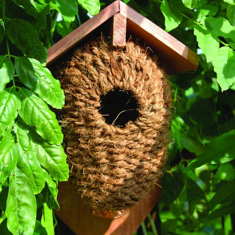 Kókuszrostból és fából készült madárház, amely búvóhelyet és fedezéket ad a kert madarainak. Esősebb időben a tető védelmet nyújt, a kókuszrost bejáraton az állatok kényelmesen megkapaszkodhatnak. Helyezzük el nyáron egy hűvösebb, árnyékos részen vagy télen a kert bármely pontján, a madarak pedig gyönyörű csicsergéssel hálálják meg a gondoskodást.