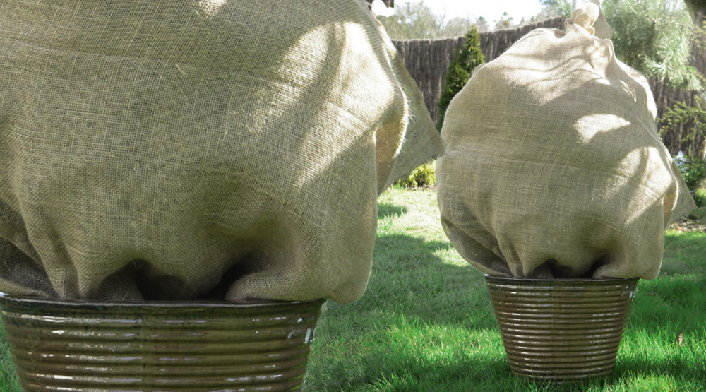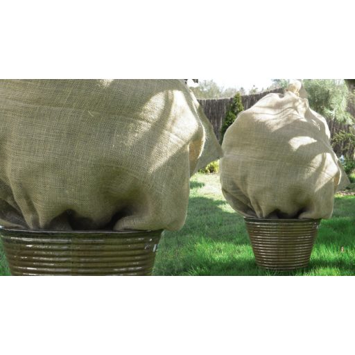 Juta átteleltető zsák. Természetes védelem a növényei számára. Szőtt juta szálakból készült. Súlya: 300 g/m2