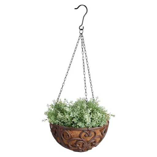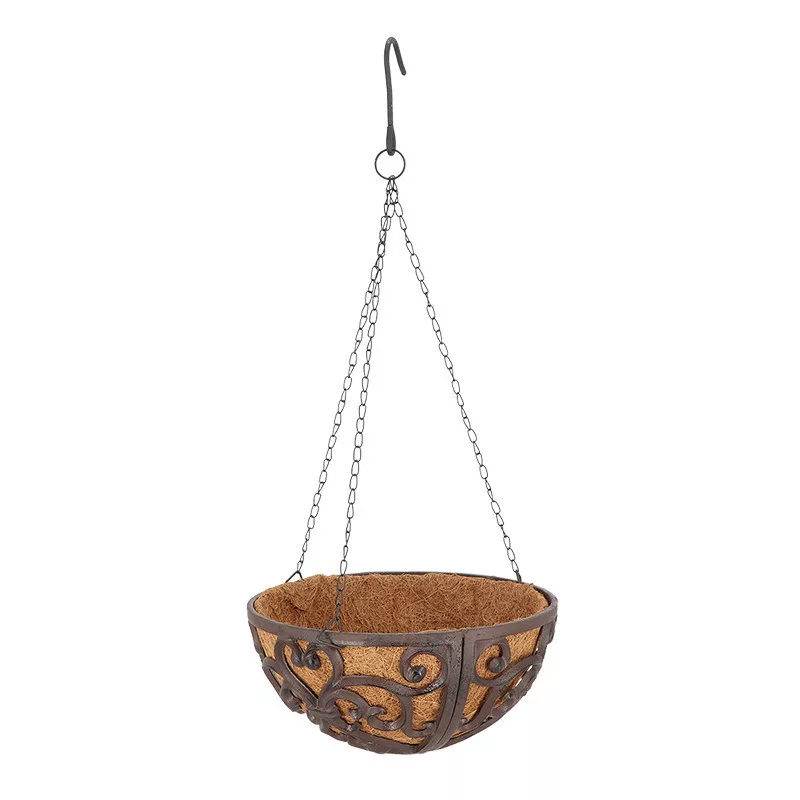 Elegáns öntöttvas virágkosár klasszikus mintával, amely bárhova könnyen felakasztható. Kókuszrost bélésének köszönhetően kedvenc virágaink közvetlenül is beleültethetők. Dekoratívan mutat az erkélyünkön vagy a kert bármely részén. A természetes kókuszrost anyag segíti a levegő átjárhatóságát, az egészséges, dús virágzást és megtartja a növény nedvességét. Könnyen formázható, nyomelemekben gazdag, illetve jó vízfelvevő képességgel rendelkezik. A kókuszrost betét cserélhető, megfelelően szellőzik benne a növény gyökere.