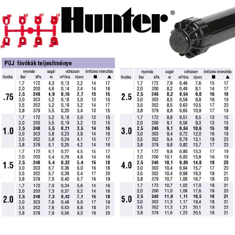 - öntözési intenzitás: kb. 16 mm óránként 2,8 bar nyomásnál, 4,6 és 11,3 m közötti fejtávolságnál