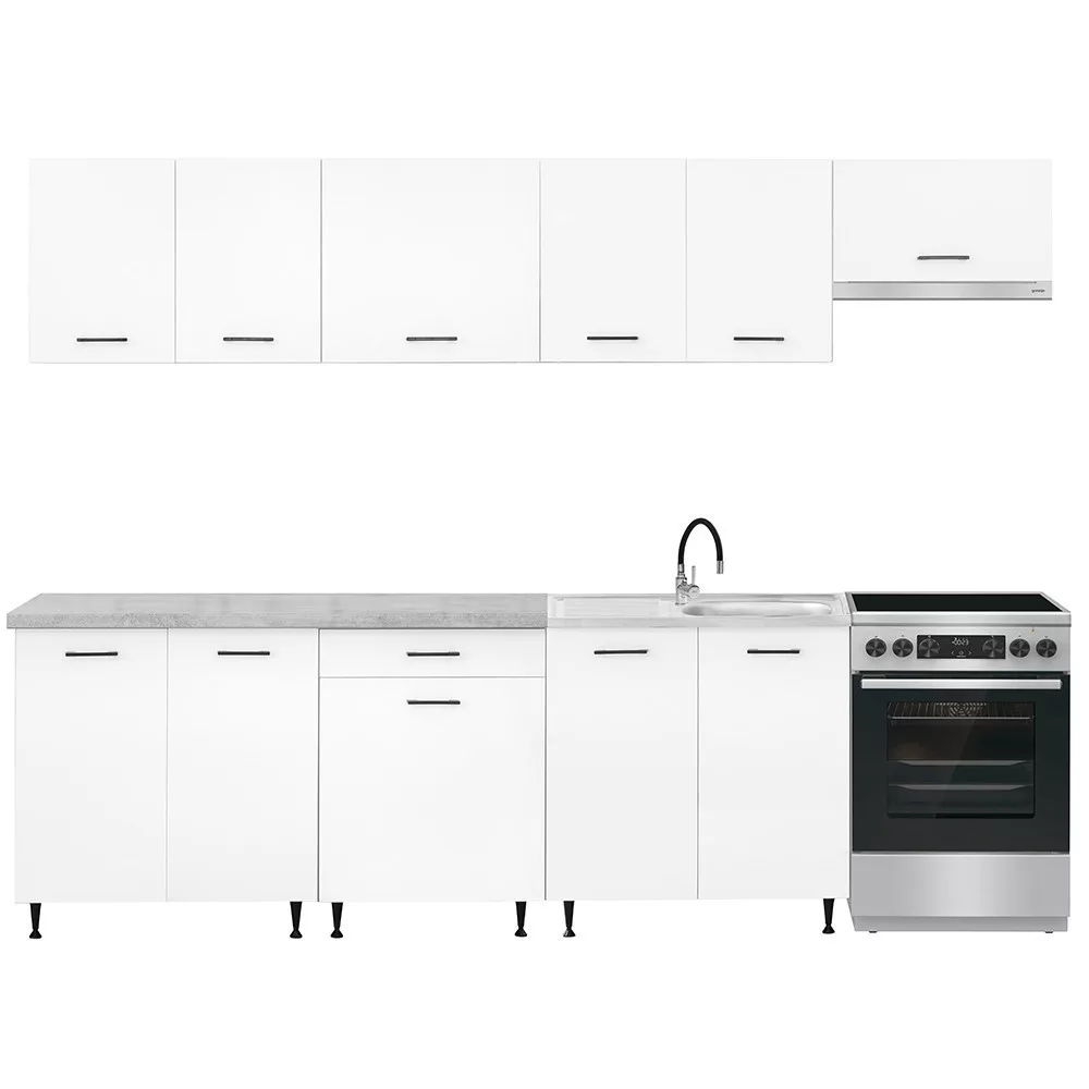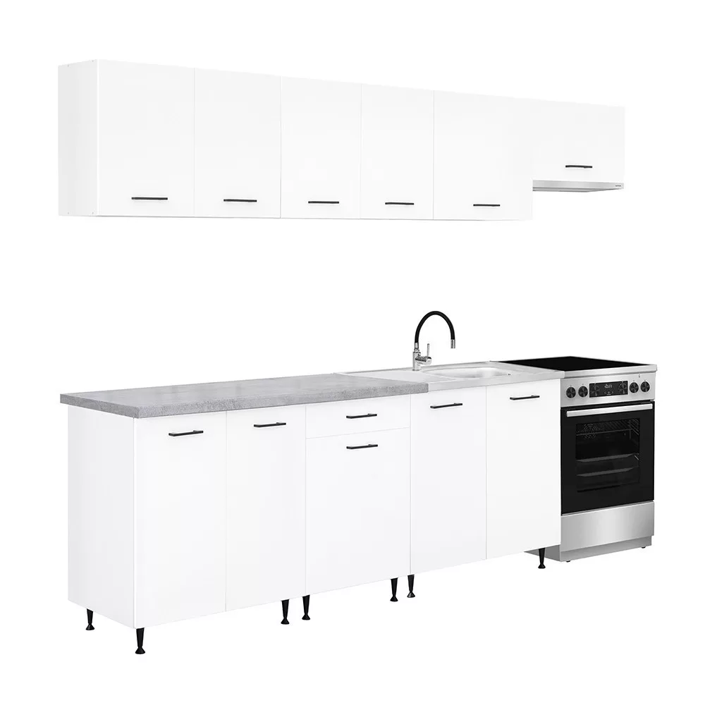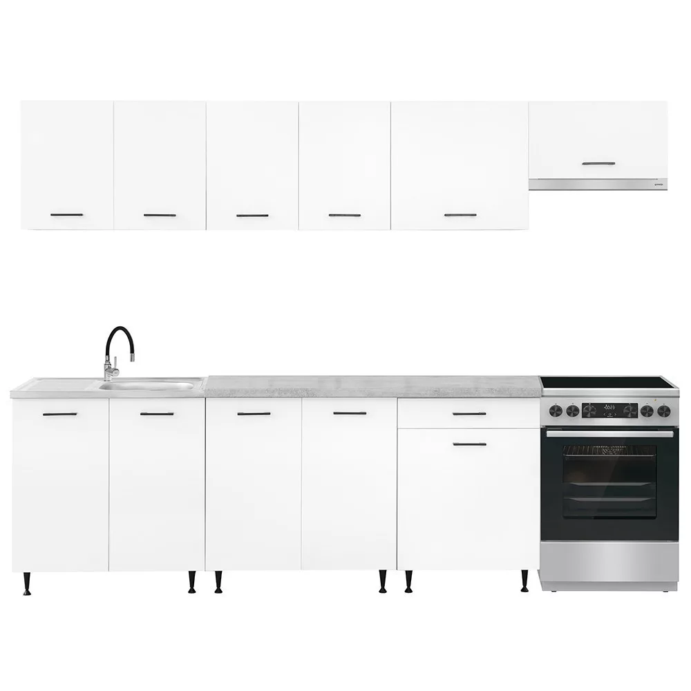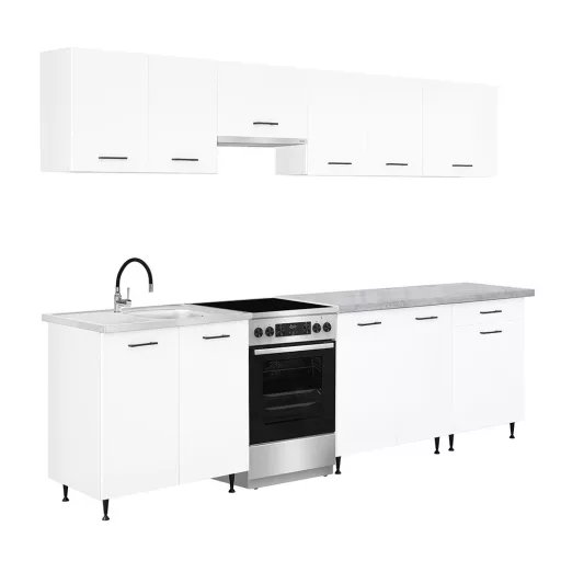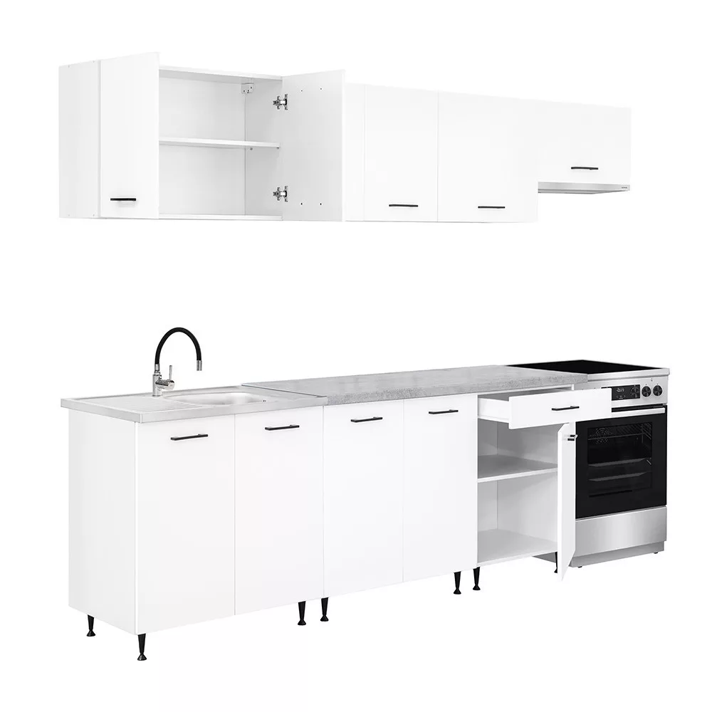 A 280 cm széles konyhabútor négy felső és három alsó szekrényből áll, amelyek praktikus tárolóhelyet kínálnak a konyhai eszközök számára. A két 80 cm-es alsó szekrény alkalmas nagyobb edények vagy konyhai kellékek elhelyezésére, míg a 60 cm-es fiókos–ajtós szekrény jól használható evőeszközök és kisebb tartozékok rendszerezésére.