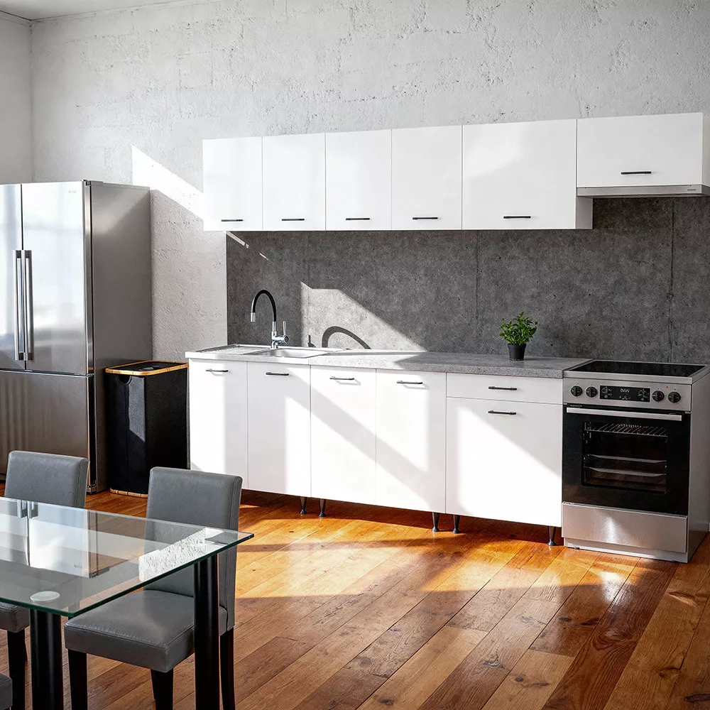 A Leziter Primo 280 konyhabútor fehér korpusszal és Chromix tölgy munkalappal könnyen illeszkedik a modern otthonok világos, letisztult enteriőrjébe. Harmonikus színvilága friss, tágas hatást kelt, így ideális választás közepes vagy nagyobb alapterületű konyhákhoz. Átgondolt elemkiosztása praktikus, jól szervezett mindennapi használatot kínál, miközben egységes, rendezett összképet biztosít.