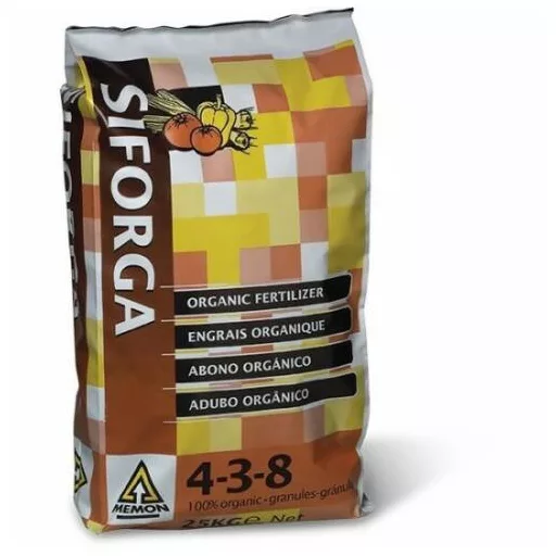 A SIFORGA 5-3-8 nagyobb részt baromfitrágyából, kisebb részt egyéb szerves eredetű összetevőkből készül. Felhasználása: Dísznövények: 4-6 kg/m3 dózisban kell a tőzeghez vagy a virágföldhöz keverni. A különböző dísznövények eltérő tápanyagigényekkel rendelkeznek. Általában a kevesebb mennyiség is elegendő, ezért kisebb adaggal kezdjünk, majd a növény igényeit figyelve növeljük a kiadagolt mennyiséget. Cserepezőgépekhez is alkalmazható. A tartós műtrágyák használatát kiválthatja, 4-6 hónap alatt bomlik el, és folyamatosan látja el tápanyaggal a növényeket. Paprika: az intenzívebb kultúrák közül a paprika esetében a sorok, illetve az ikersorok alá kell szórni a terméket. A kijuttatott dózis a talaj tápanyag ellátottságától függ, de hozzávetőlegesen 20-40 kg/100m2. Szamóca: 500-1000 kg/ha palántázás előtt ideális a talajba juttatni, legalább 10 cm mélyen. A szamóca rendkívül káliumigényes növény. A SIFORGA kiválóan alkalmas a kálium visszapótlására. Örökzöldek trágyázásához is kiválóan alkalmas. Magas mikroelem és kimagasló szerves anyag tartalma miatt jobb kultúrállapotú a növényállomány, nagyobbak és élénkebbek a virágok, a növények gyökérzete bujább, erősebb. Örökzöldeknél megfigyelhető az áttelepítés utáni gyorsabb regenerálódás. Kijuttatható mennyiségek: SIFORGA 5-3-8 (kg/ha) Kijuttatása: gépi szórással, vagy kézzel. A kijuttatás után öntözés szükséges. A granulátum a talajjal és a nedvességgel érintkezve kiválóan oldódik. 5-10nappal ültetés előtt a sorok alá is ki lehet juttatni, úgy hogy a növény gyökereivel közvetlenül ne érintkezzen. Gyümölcsfák1000-2500 Szamóca 500-1000 Szőlő 500-1000 Virágok 1000-2000 Faiskolai nevelés 500-1000 Technikai adatok: Száraz anyag:90,00% Szerves anyag: 65,00% Nitrogén (összesen):5,00% Nitrogén szerves:4,60% Foszfor (P2O5):3,00% Kálium (K2O):8,00% Magnézium (MgO):0,80% Kalcium (CaO):6,50% PH:7 C/N:7 K1*0,5 mikroelemekben gazdag: Fe, Mn, B, Mo, Zn, Cu káros kémiai anyagoktól mentes, klórtartalma alacsony *a szerves anyagok egy része egy év múltán sem bomlik fel teljesen, ezért a talajban ezután is fellelhető