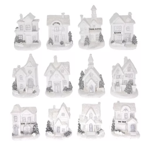 A 10 cm magas,LED-es téli házikók finoman kidolgozott részleteikkel és meleg fényűvilágításukkal a karácsonyi dekoráció elengedhetetlen elemei. Fehér és ezüstszínekben, 12 különféle változatban kaphatók – minden darab egyedi, kézzelfestett hatású. Elemekkel működnek, így könnyedén elhelyezhetők asztalon,polcon vagy ablakpárkányon. Külön-külön vagy együtt is hangulatos minifalutalkotnak.