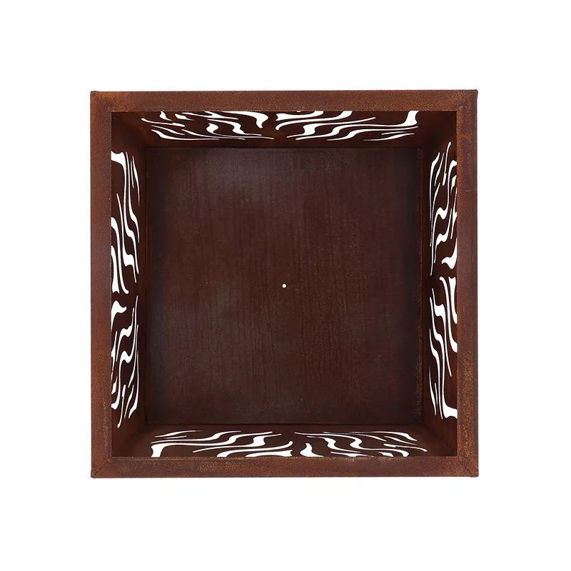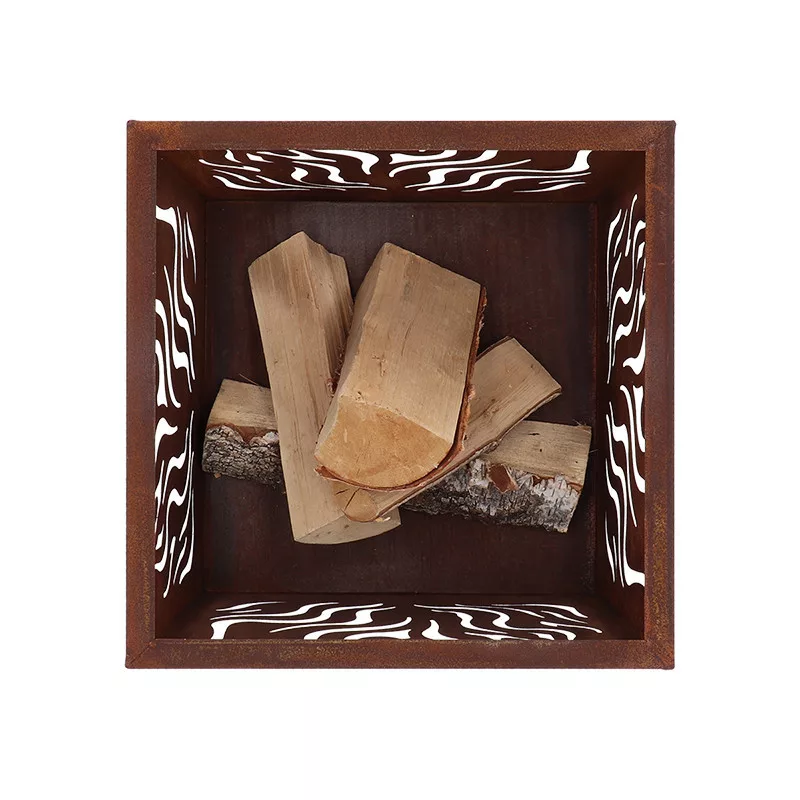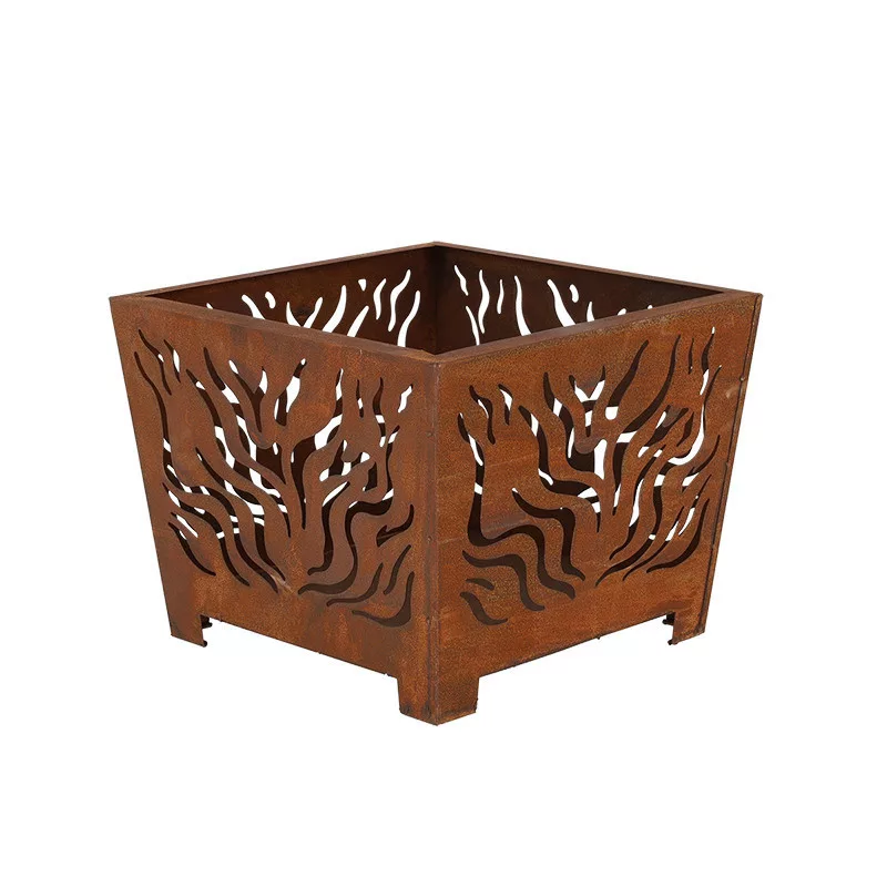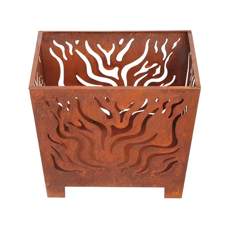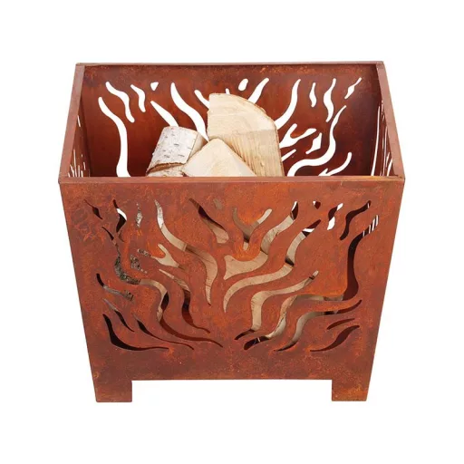 Lézervágott, egyedi megjelenésű tűzrakó kosár láng mintával. A fém oxidációja szemet gyönyörködtető, rusztikus stílust hoz létre, amely sosem megy ki a divatból. A kertben elhelyezett tűzrakó kosár központi eleme lehet otthonunknak, ahol hangulatosan beszélgethetünk a hűvősebb estéken. Használat után egy még patinásabb termék jön létre. Tökéletes ajándék kortól függetlenül bárkinek, aki szeretné élvezni a kinti kellemes levegőt és a lángokban gyönyörködni.