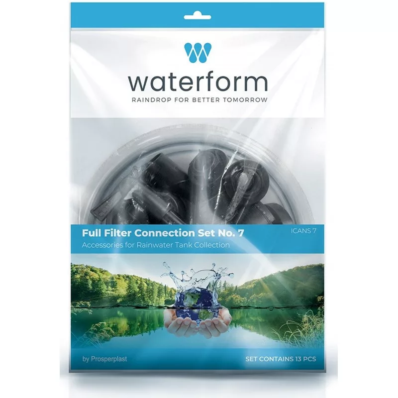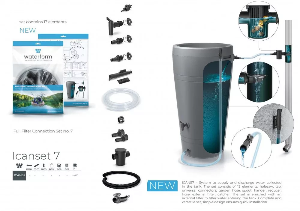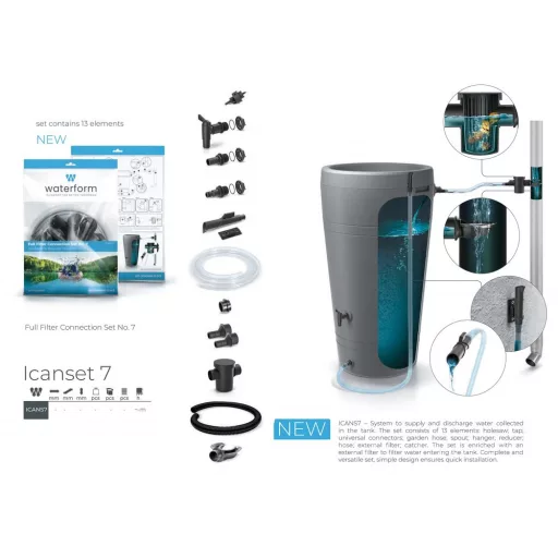 A készlet lehetővé teszi a hordóban összegyűjtött esővíz elvezetését. A készlet 13 részből áll: fúrófejek, csatlakozók, csap, gyorscsatlakozó, átlátszó kerti tömlő, tömlődugasz, tömlődugasz tartója, 3 csatlakozó, összekötő tömlő, külső szűrő, csutora. A készletet egy külső szűrő teszi teljessé, amely kiszűri a nagyobb méretű szennyeződéseket az esővízből. Univerzális készlet.