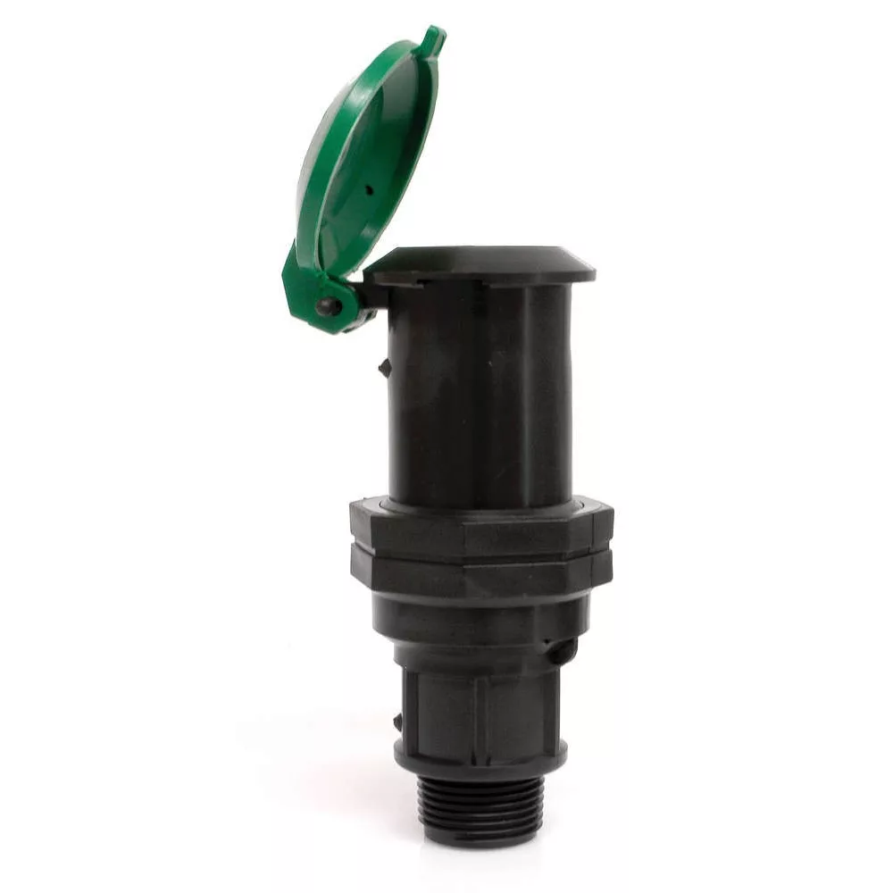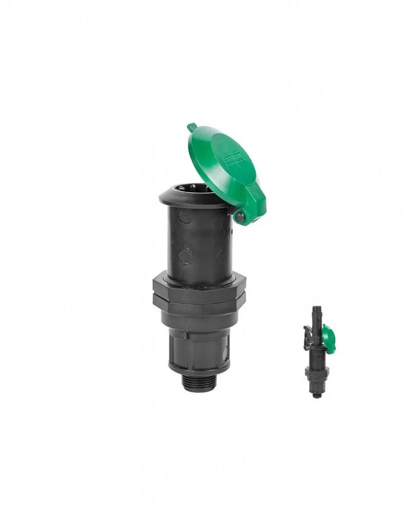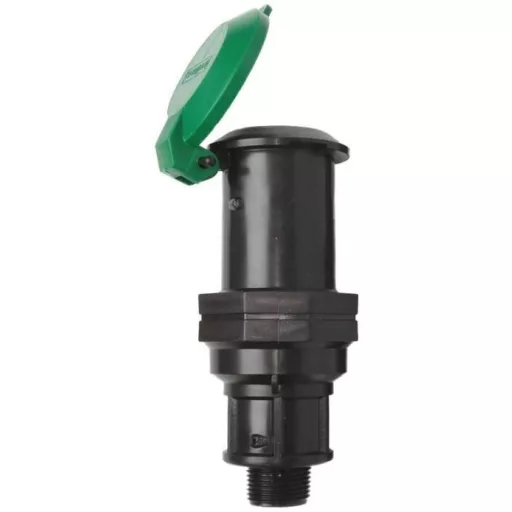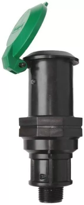 A földbe süllyesztett vízkonnektor 3/4" col KM külső menetes alsó vízbekötésű, zöld színű kerek fedele zárható.