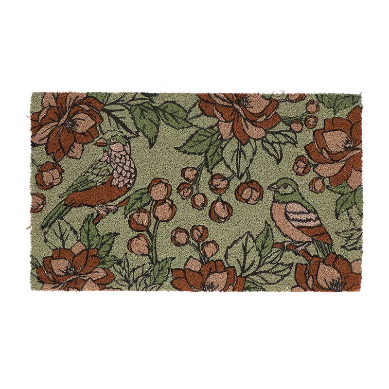 Virág és madár mintás kókuszrost lábtörlő, zöld, 75 x 45 cm