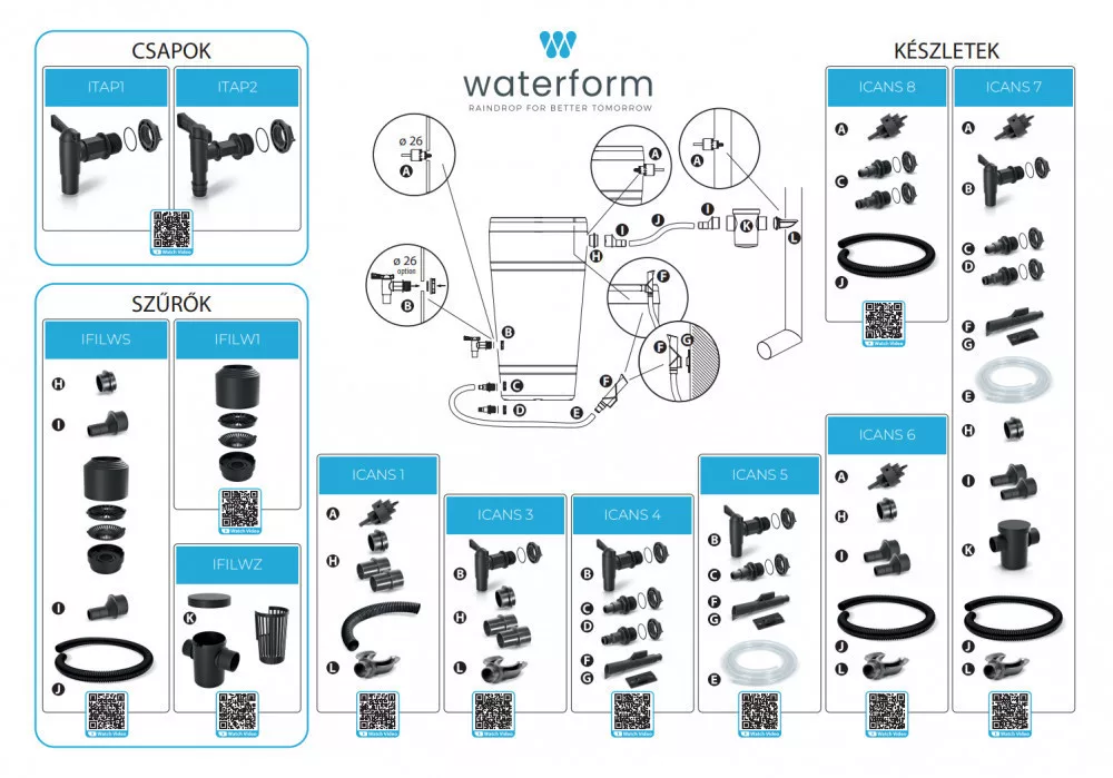 Teljes szett (csap, csatornabekötés, leeresztő nyílás, átlátszó cső, 20 mm-es gégecső, szűrő, koronafúró adapter): Esővízgyűjtő S7 csatlakoztató készlet ican set 7