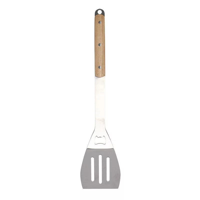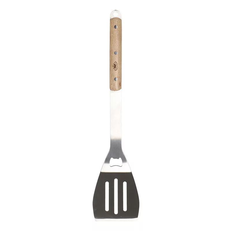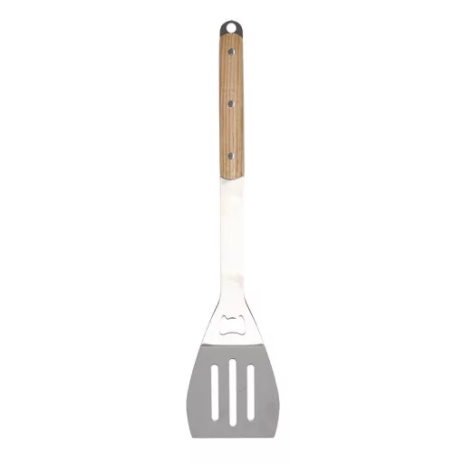 Rozsdamentes acél BBQ grill forgató lapát fa nyéllel, beépített üvegnyitóval, 44 cm hosszúságban. Praktikus grilleszköz az ételek forgatásához, kiszedéséhez, mely a szabadtéri, kerti sütés-főzés elengedhetetlen kelléke! Hosszított kialakítása megóvja kezünket az égési sérülésektől, a lapát kialakaítása pedig lehetővé teszi, hogy az ínycsiklandó falatok kiszedése során ne kerüljön felesleges zsír a tányérunkra. A grillapát különlegessége, hogy palacknyító is található a nyélen, így akár sörnyitóként is használhatjuk. A forgató lapát nyelének borítása kőrisfából készült, így fogása stabil, kényelmes, a lapát nem melegszik át. Rozsdamentes acél alapanyagának köszönhetően kényelmesen tisztítható, és hosszú éveken keresztül hű társunk lesz a grillezésben. Használaton kívül a fém akasztónak köszönhetően egyszerűen tárolható.