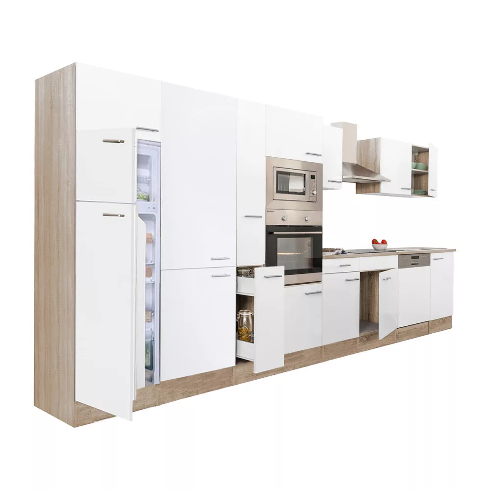 Yorki 430 konyhabútor sonoma tölgy korpusz,selyemfényű fehér fronttal felülfagyasztós hűtős szekrénnyel